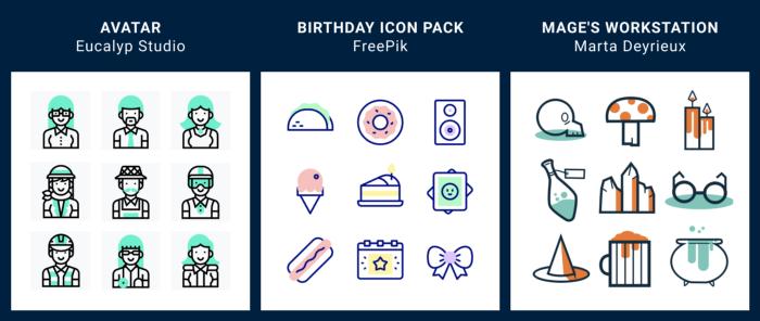 线条形状图标集示例。Eucalyp Studio的Avatar,FreePik的Birthday Icon Pack,Marta Deyrieux的Mage's Workstation 。