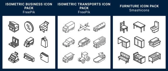 等距大尺寸图标样例:FreePik的Isometric Business Icon Pack ,Isometric Transports Icon Pack , Smashicons的Furniture Icon Pack 。