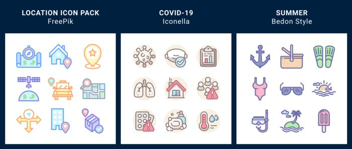 填充浅色轮廓图标集示例。FreePik的Location Icon Pack,Iconella 的COVID-19, Bedon Style的Summer。