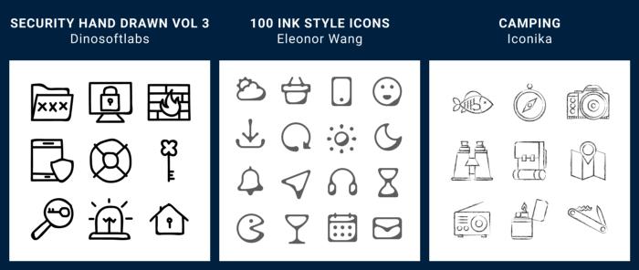 大尺寸手绘线图标样例。Dinosoftlabs的Security Hand Drawn,Eleonor Wang 的100 ink style icons, Iconika的Camping 。