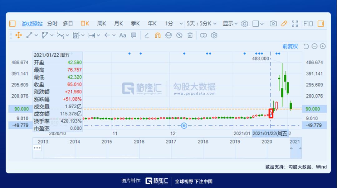 2020年1月22日,香橼发推称GME只值20美元,散户们随后集体冲进股市。当天,GME成交量超过1.97亿股。截至收盘涨超51%,报65美元。由于波动性过大,该股一度触及熔断。这根阳线,是美国梦开始的地方。