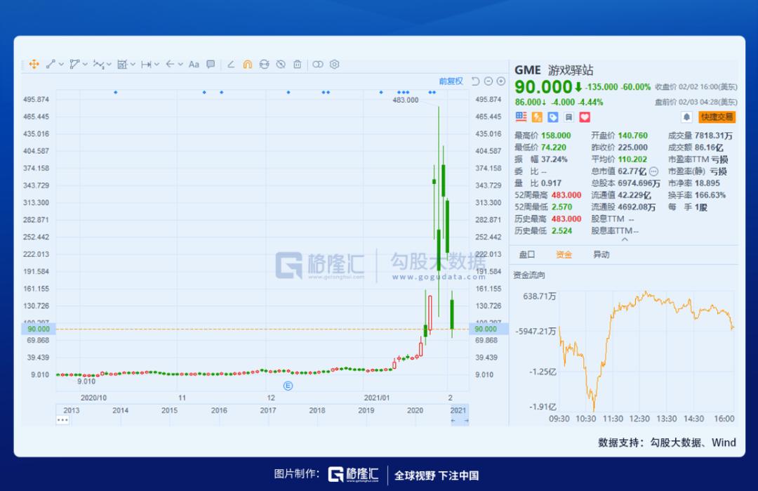截至2月2日美股收盘,WSB概念股全线重挫。游戏驿站暴跌近60%,创下上市19年来最大单日跌幅。加上前一天跌去的30%,两天之内,GME累跌超过72%。今日盘前,GME股价现报86美元,几乎回到1月22日战火初燃时的水平。