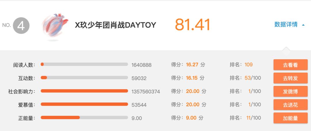 除了热搜,微博设计了一套包括阅读人数、互动数、社会影响力、爱慕值、正能量值五个维度的动态评分体系,牢牢地将明星经济公司、粉丝和品牌广告主关注的焦点锁定在微博榜单上。