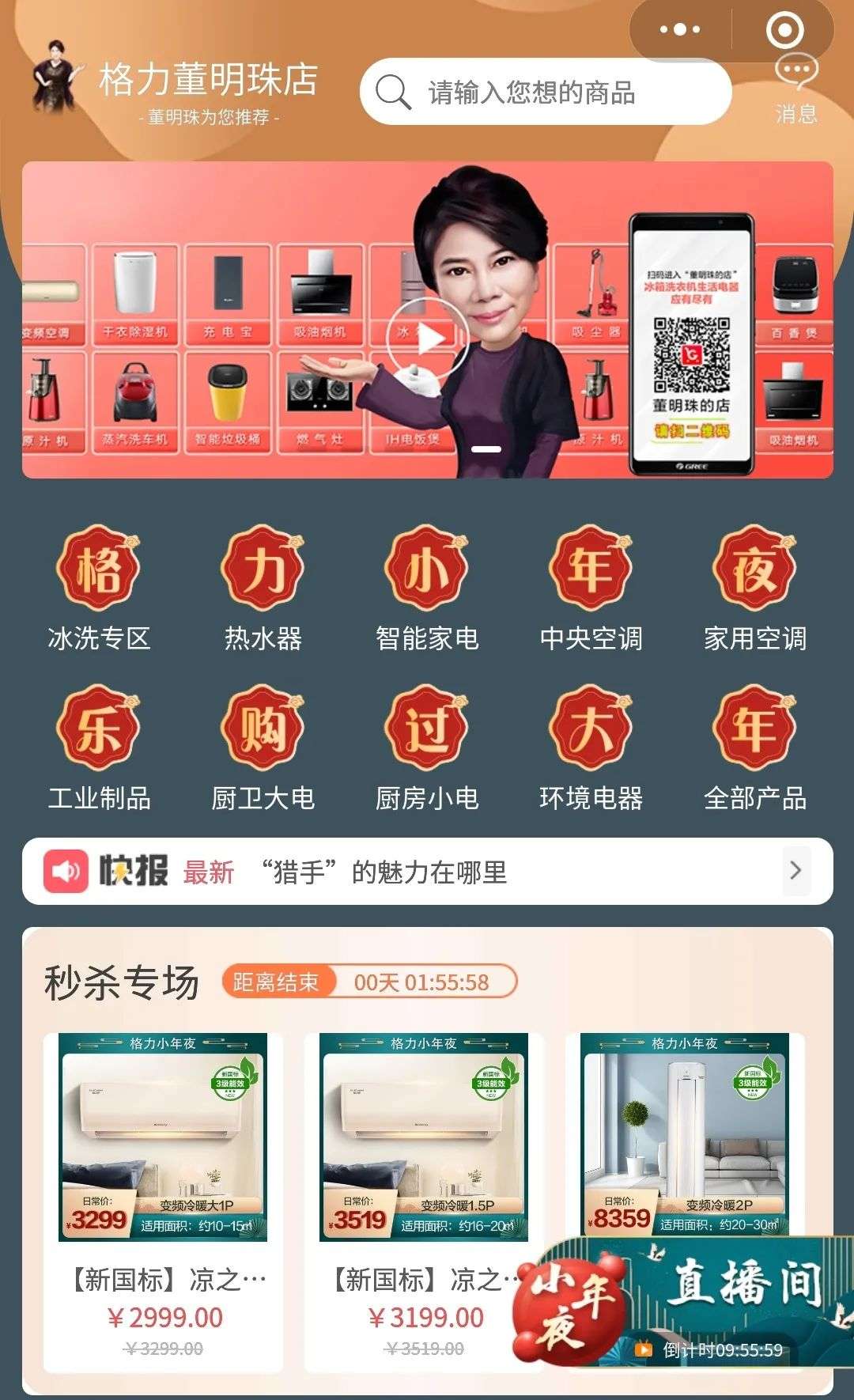 就算有低价诱惑,在“格力董明珠店”小程序这个自成一派的舞台上,想要出圈似乎也不容易。《IT时报》记者在“格力董明珠店”小程序内看到,以某家“格力工厂授权店”为例,不久前曾在一天内连开三个秒杀专场,空调定频冷暖最低只需1699元,可惜直播间观看人数仅为57人,人气可谓低迷。