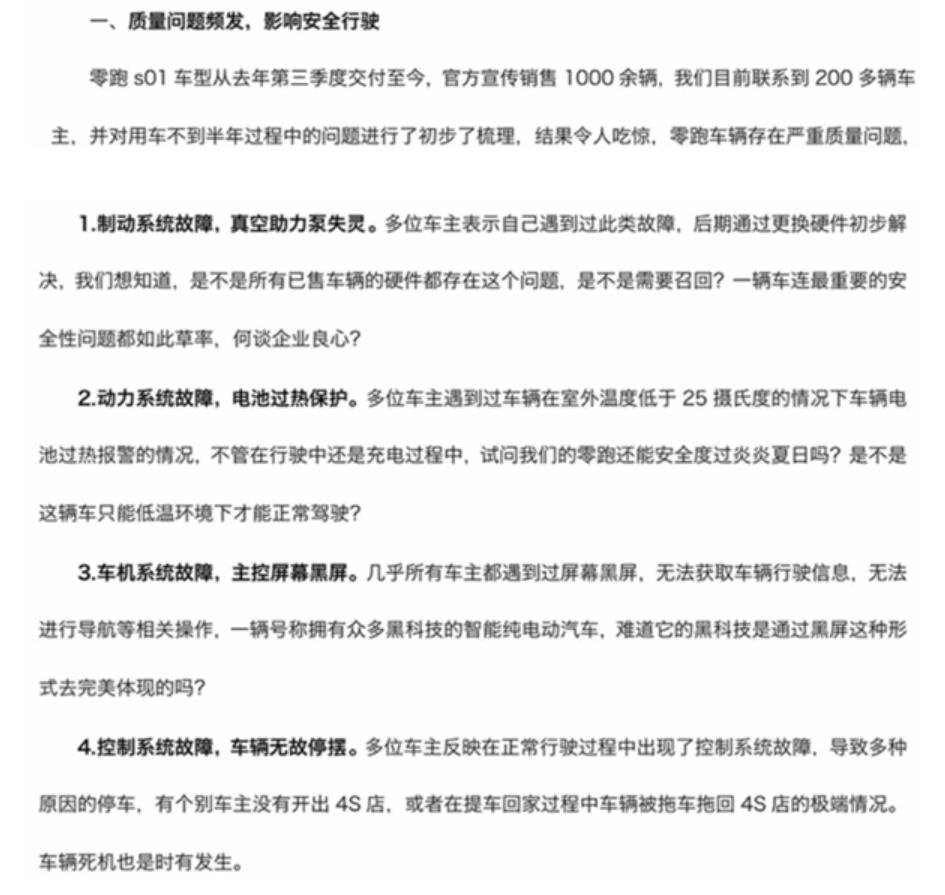 在2020年5月,200多名零跑S01首批车主集体维权,在网上公布了致零跑汽车的公开信,列举了四大类质量问题,涉及制动系统故障,真空助力泵失灵;动力系统故障,电池过热保护;车机系统故障,主控屏幕黑屏;控制系统故障,车辆无故停摆等。