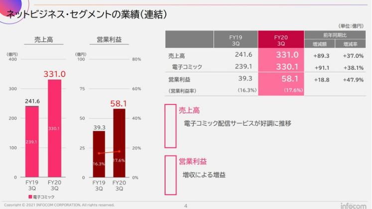 Infocom的网络商务业务第3季度累计(20年4~12月)业绩,销售额同比增长37.0%,达到331.02亿日元,营业利润同比增长47.9%,达到58.15亿日元,收益实现大幅增长。