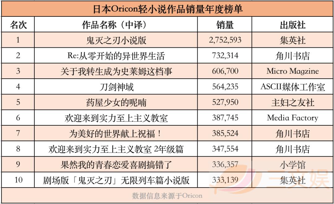 《剧场版「鬼灭之刃」无限列车篇》小说版在今年发售,但也强势挤进前十的榜单,居于畅销榜第十,销量33万。而在2019年,《天气之子》电影改变小说也获得轻小说榜单第二的位置。