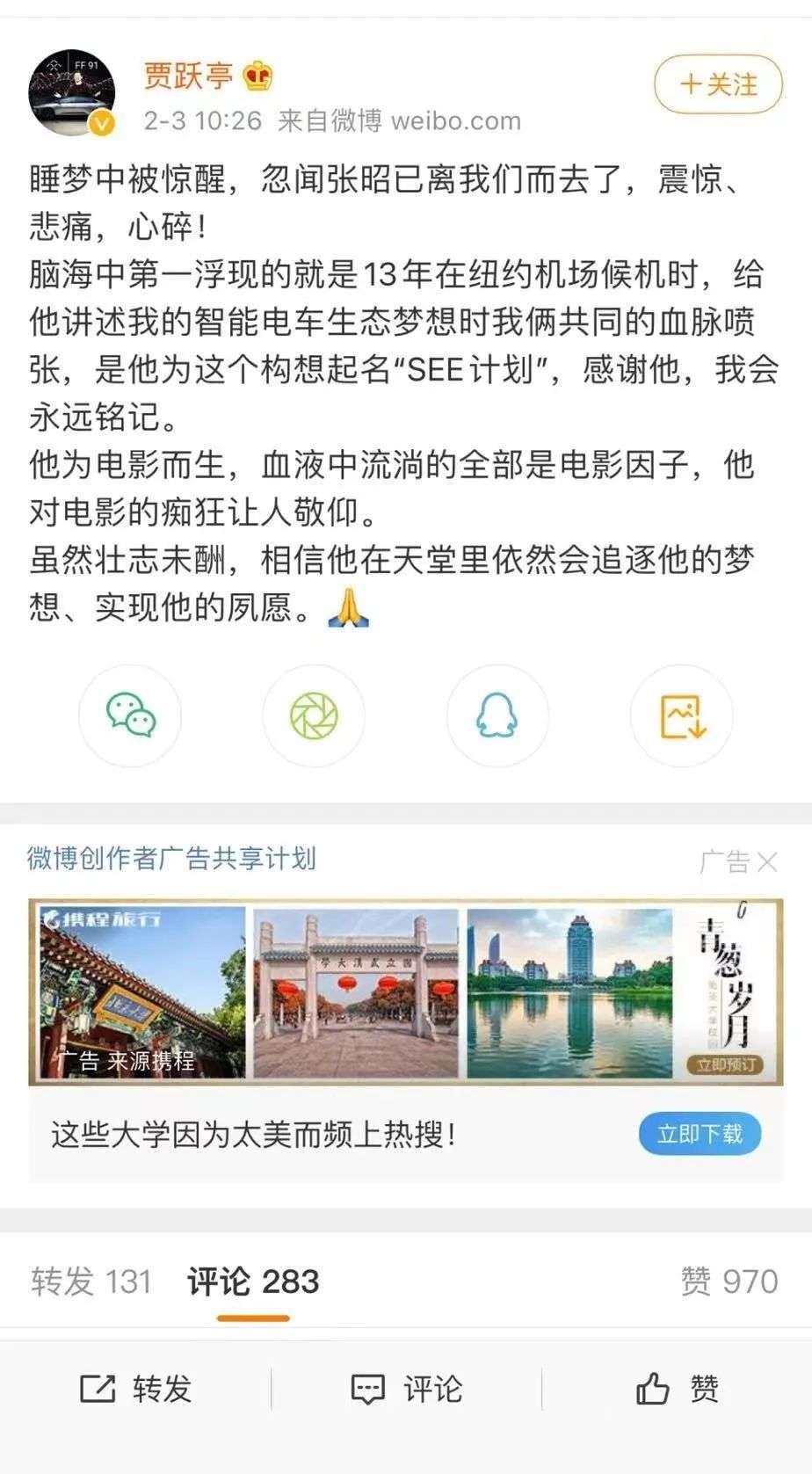 美国时间2月3日清晨,曾于危难时刻接受了乐视影业17亿元现金注入的贾跃亭在微博上发表了对张昭的纪念文字,并出现在了他的治丧委员会名单中。
