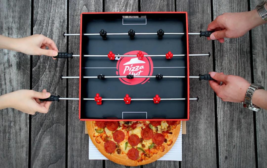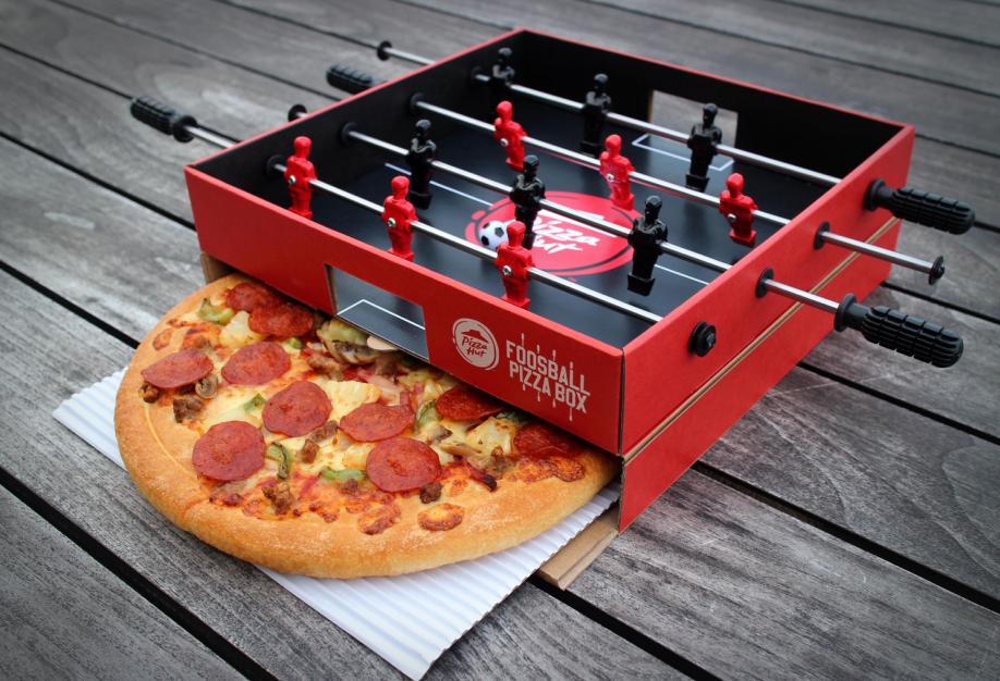 必胜客就在3个月前推出了一款带有桌上足球台的包装盒,让你可以和好友嘴里叼着美味的披萨,来一句紧张刺激的桌上足球。