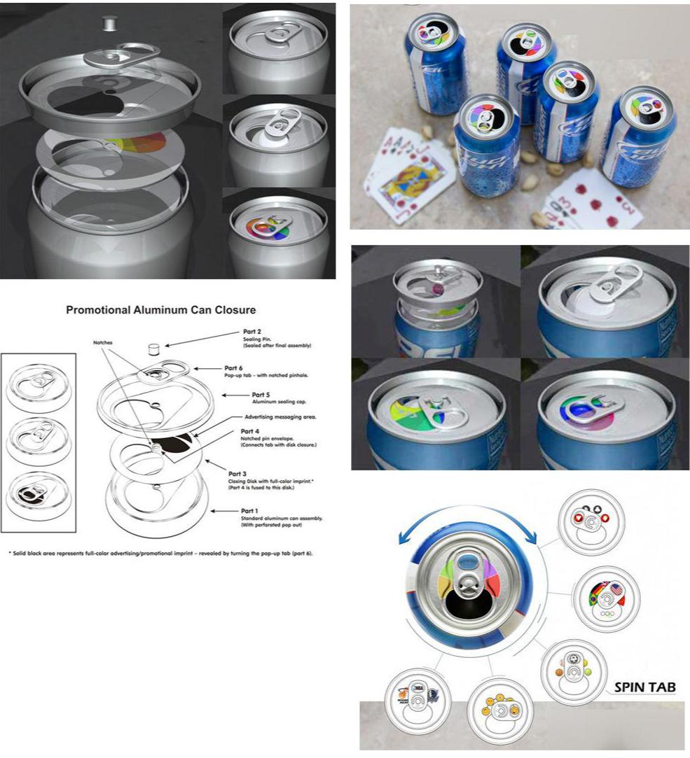 据统计,全球每年销售约2500亿个铝罐[4],以往营销人士的注意力都集中在如何把罐体设计的引人注目上,但也有人看中了罐顶拉环处的商机。