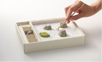 如果你更习惯独处,你一定很难抗拒下面的这款日式点心。它的包装被设计成了一座日式庭园,有黑芝麻做成的岩石,砂糖做成的细沙,可以一个人慢慢观赏,用附赠的木耙清扫庭院,感受其中的禅意,再静静享用美味的和果子。