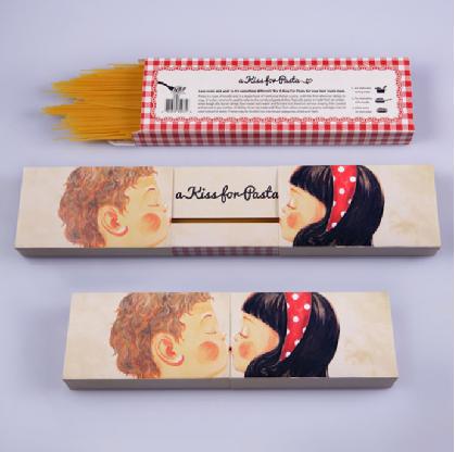 设计师重构了人们抽拉外包装的过程,将它设计成帮助两个可爱小人接吻的温馨体验,相信用这样的方式拿出的意面,吃起来会更加香甜美味。而且这个过程是不是也会让你联想起迪士尼动画电影《小姐与流浪汉》里两个小狗的“意面之吻”呢?