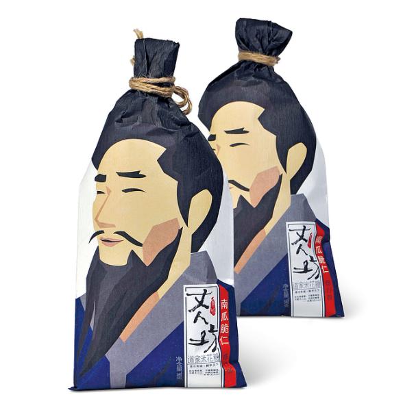 他们把米花糖的包装做成了一个道人的形象,封口处用麻绳缠绕。开袋和封袋的过程就被巧妙的转化为了给道人绑发髻。