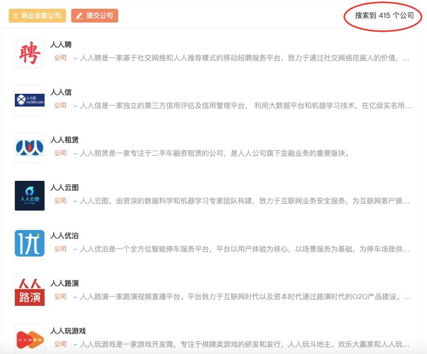 在 IT 桔子数据库,搜索「人人」会得到 415 家这个系列的公司名称——