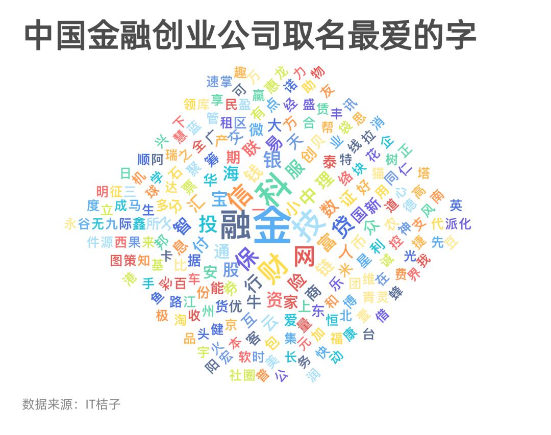 金融类公司取名趋向于表达「金」、「财」、「银」、「宝」、「富」这样的愿望,非常契合帮助用户达成财富的保值与增值的目的。「科技」、「智能」这样的字眼也是近几年成立的金融公司中的高频词。