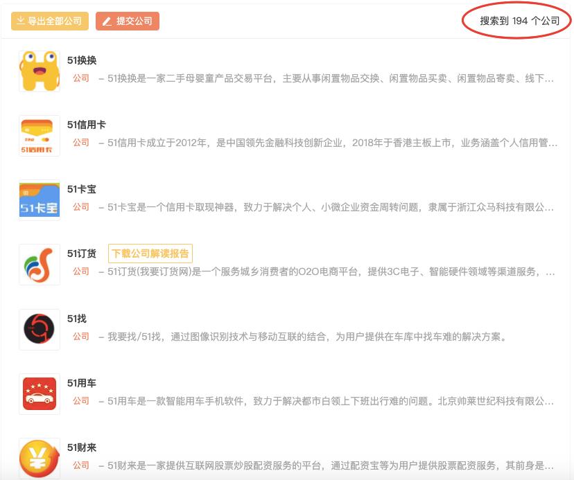 还有一种类似的、被广泛使用的是「51X」的名称,IT 桔子库里有将近 200 家这样的公司,知名的有 51talk、51 信用卡等等。