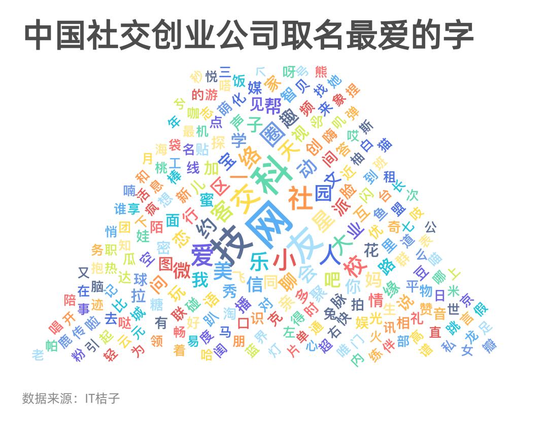 社交类公司中,最高频的「网」字代表了这类公司是依托于互联网的存在才得以诞生,反应其基本行业属性。「交」、「友」、「约」、「圈」、「社」、「爱」、「聊」这些关键词基本代表了社交产品的最原始的目的。