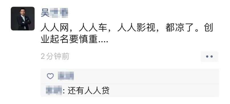 知名投资人吴老板发了个朋友圈感慨:这么多「人人 X」系的创业公司都迎来不好的结局——创业起名要慎重呀!