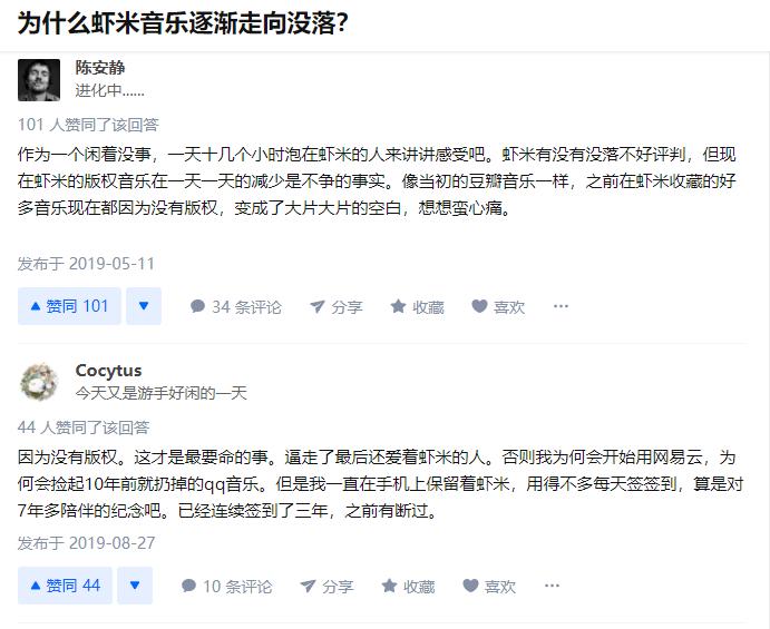 2018年9月,阿里音乐与腾讯音乐转授合作到期后再未续约,虾米音乐被爆出大规模下架索尼、华纳、周杰伦曲库,用户哀嚎声一片。知乎“为什么虾米音乐逐渐走向没落”问题下,满屏都是对其版权少的控诉。