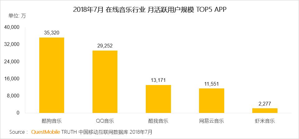 逆水行舟,不进则退,虾米的衰颓无可挽回。Questmobile《中国移动互联网在线音乐行业报告》显示,2018年7月,腾讯音乐和网易云音乐的MAU都在亿级阵营,而虾米音乐则仅有2277万,位列第五,已然跌出第一梯队。
