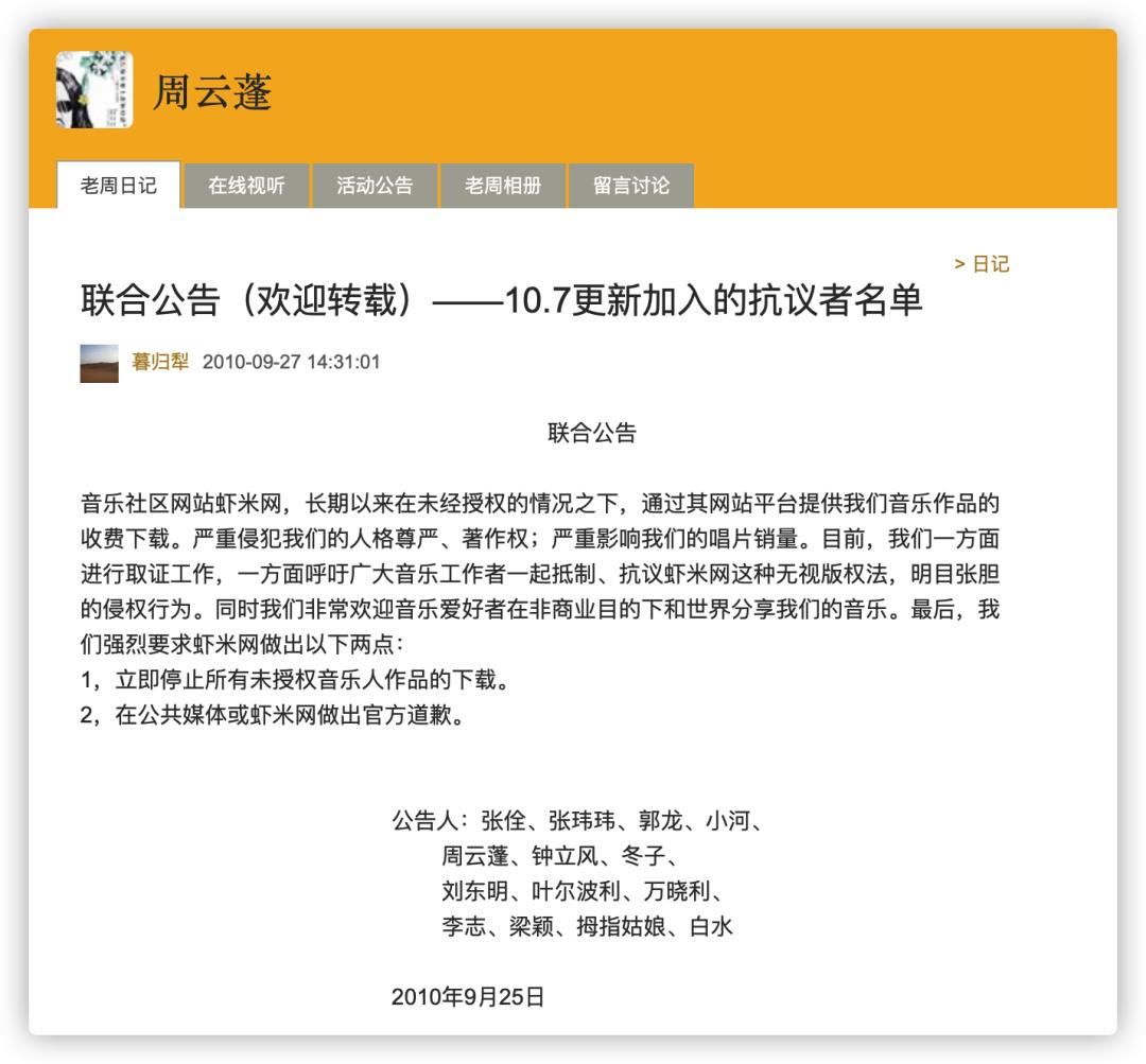 2010年9月,李志、周云蓬联合张佺、张玮玮、郭龙、小河、钟立风、万晓利、左小祖咒等数十位音乐人发布联名公告,控诉虾米音乐侵权上架独立音乐人作品的行为。这份公告,至今还留在周云蓬的豆瓣主页上。而随后一段时间里,这些音乐人的作品都在虾米上消失不见。