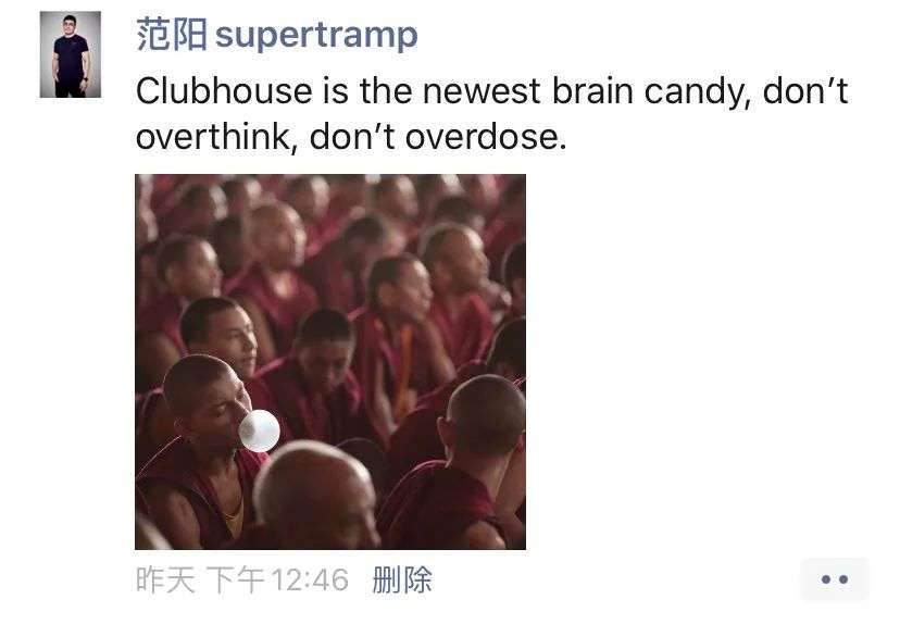 Clubhouse是一个新鲜的 “大脑的糖果”,它启动了我们的好奇心和虚荣心。这个时代每个人都对在线生活上瘾,每一个产品都在挑逗我们的多巴胺,你选择对哪一种产品上瘾的权力在于你。