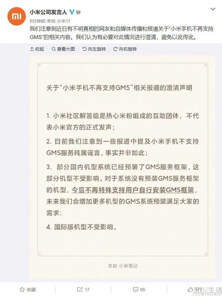 但这件事的真相究竟是怎样的呢?同样是在2月4日下午,小米手机系统软件部总监张国全以及“小米公司发言人”官方账号先后发布了详细的辟谣内容,对此次“谷歌GMS服务”事件给出了详尽的解答。