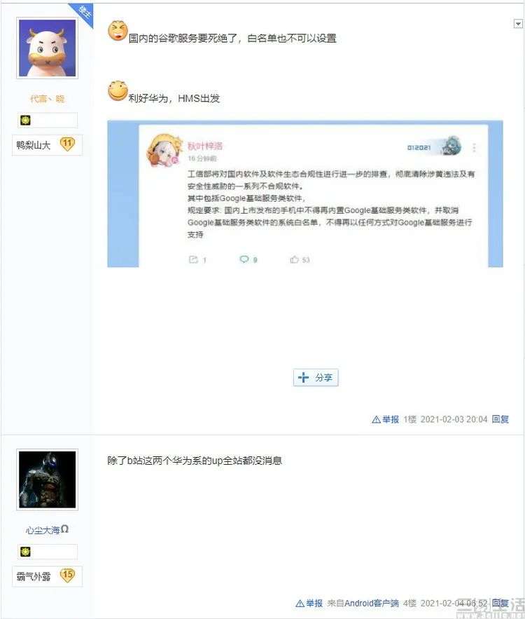 事实上就在这份解答出炉后不久,即有个别动机不明的人士在社交媒体上宣称,谷歌GMS服务即将“被禁”,而且乍一看说得非常详细。虽然也有网友提出怀疑,表示从未在任何其他平台或渠道见到过相关佐证,但从我们三易生活的简单调查来看,这番言论到截稿时(2021年2月4日下午)为止,已经引发了一定程度的恐慌,甚至影响到了部分Android开发者的工作安排。