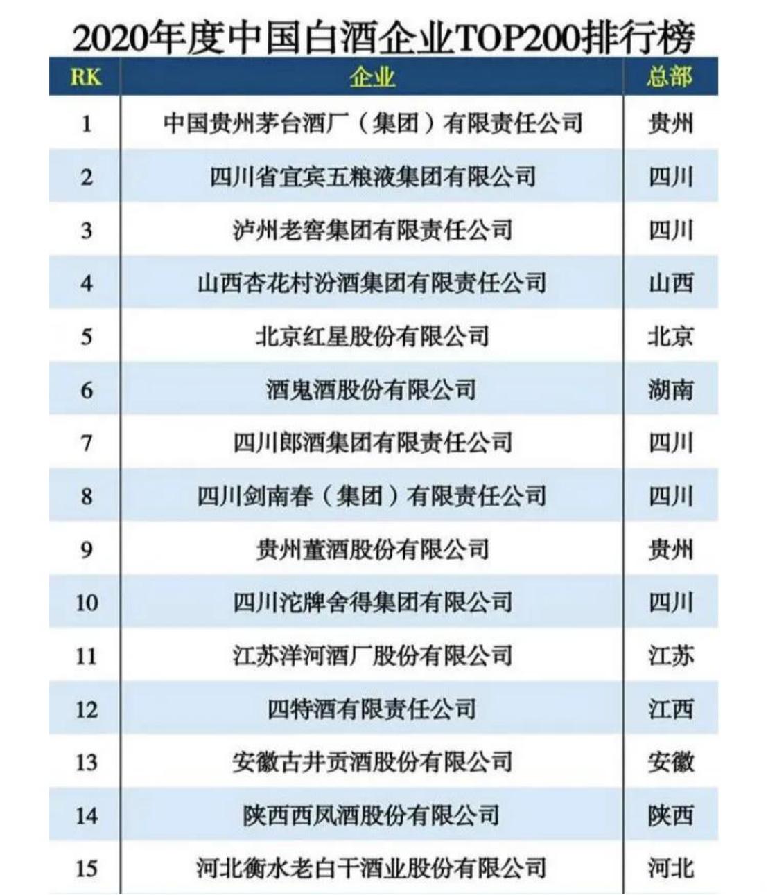 图:2020年中国白酒企业200强前15节选—《互联网周刊》