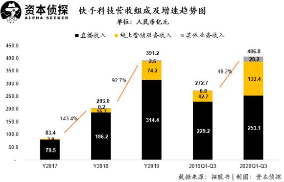 快手线上营销服务收入在2018年、2019年及2020年上半年分别同比增长326.3%、345.5%和222.5%,营销服务收入占比也从2017年的4.7%,一路爬升至2020年上半年的28.3%(2018年、2019年占比分别为8.2%和19%)。