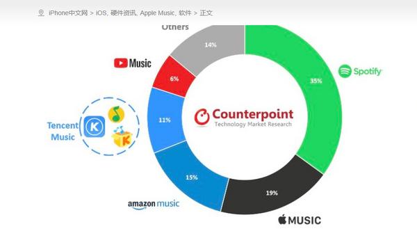 根据MIDIA Research的研究表明,目前全球的音乐付费市场由Spotify、苹果音乐、TME和亚马逊音乐几个巨头所占据,从市场份额上来看,Spotify拥有36%的市场份额,拥有付费用户,保持着行业领先的优势。