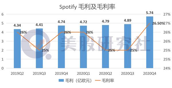 北京时间2月4日,Spotify发布了2020第四季度财报,财报显示,季度营收21.68亿欧元,同比增长17%-,季度净亏损1.25亿欧元,同比收窄40%,毛利率26.5%。在当日财报发布后,Spotify股价下跌逾8%。