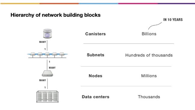 我们可以借用生物书中的“生命体构成来”理解 DFINITY 的架构:数据中心就像支撑生命构成的基础物质元素,节点则像是神经元,这些神经元连接和控制众多器官组织。每一个软件容器则像一个独立的细胞,一组软件容器组合形成的子网就像一群细胞聚集形成的器官,不同的器官具有不同的功能,当众多器官和神经元网络连接就会形成一个完整的个体,实现非常复杂的功能和操作。