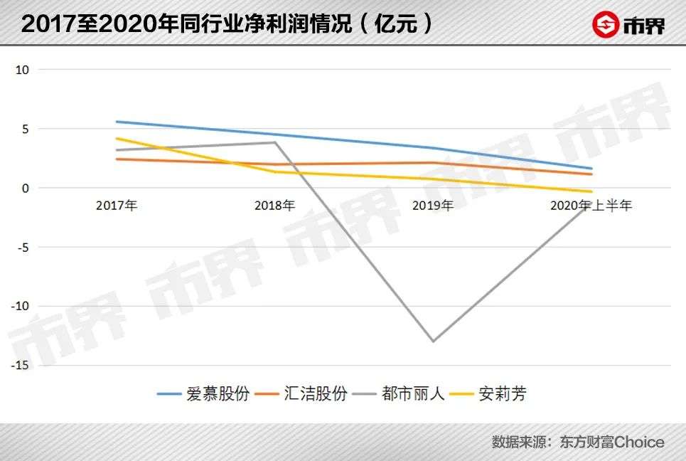 其实,面临“增收不增利”这种尴尬局面的,还有爱慕的竞争对手们。自2017年起,汇洁股份、安莉芳和都市丽人,均出现了营业收入增长缓慢、净利润下滑的态势。