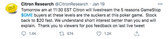 1月19日,香橼还在社交媒体上自信发声,称游戏驿站买家是“这场扑克游戏中的输家”,股价“很快会回到20美元。”但很快,该账户被一众散户的评论围攻,创始人Andrew Left及家人都未能幸免,香橼很快退出相关评论,甚至于1月29日在YouTube频道发布视频,称:将停止做空研究,专注于做多机会。