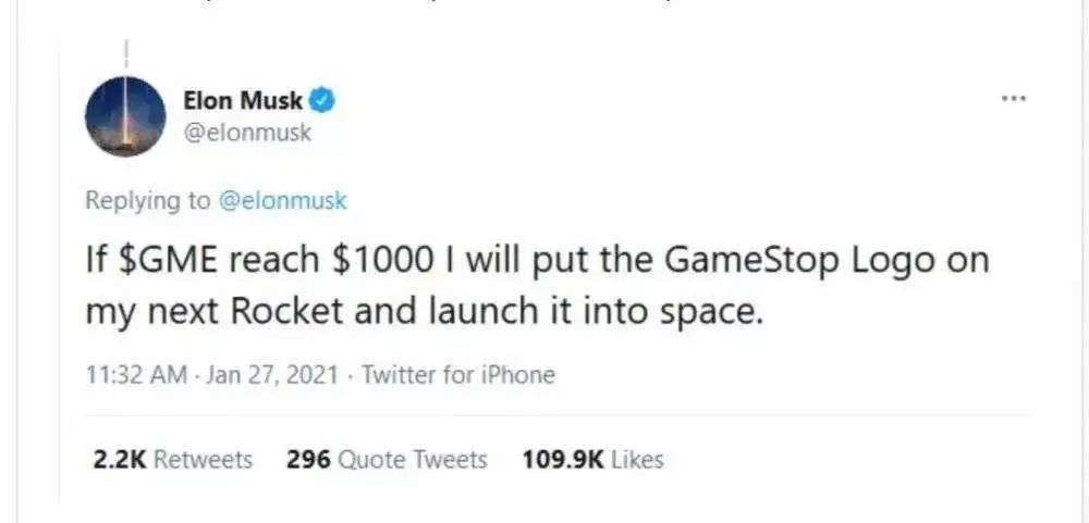 随后,华尔街机构“流氓行为”引来了一批散户一派的支持者发声。马斯克在推特公开支持WSB和散户,称“如果GME涨到1000美元,就把GameStop的Logo贴在下一个火箭上送上太空”,寓意支持散户一飞冲天的愿望。