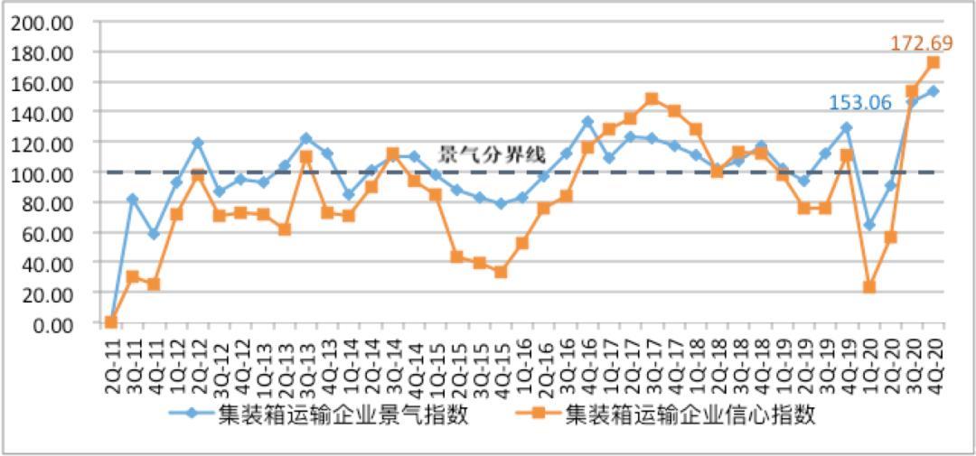 2021年1月4日,上海国际航运研究中心发布2020年第四季度中国航运景气报告。报告显示,2020年第四季度,中国航运景气指数达到122.63点,大幅提升至较为景气区间,并较2017年最高点高出2.68点,景气指数创历史新高;中国航运信心指数为141.15点,较上季度上涨25.52点,进入较为景气区间,所有企业信心指数均大幅上涨,企业家们对市场经营充满信心。