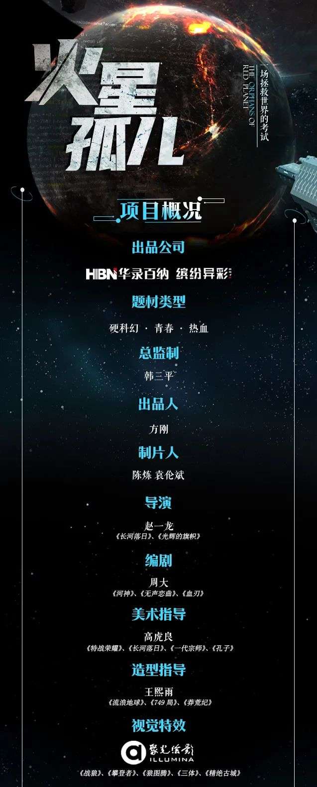 华录百纳的科幻剧集《火星孤儿》因题材和阵容,也引起了不少关注。韩三平担任总监制,视觉特效公司聚光绘影曾为《战狼》《攀登者》《狼图腾》《三体》《精绝古城》等影视作品提供视觉支持。《火星孤儿》主要讲述了在外星文明降临、世界面临崩塌之际,一群热血的高中生全力抵抗、拯救人类最后希望的故事。
