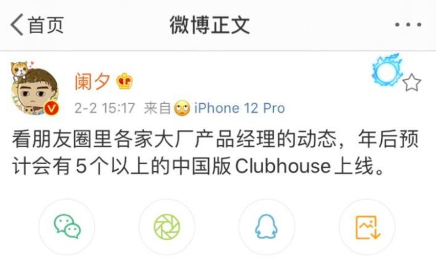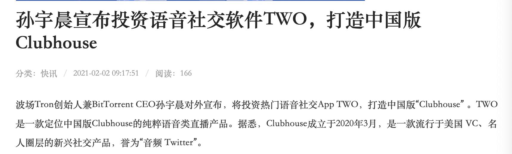 美国社交平台的热度也引发了国内互联网的关注,除了争相下载试用外,不少社交泛娱乐行业从业者也表示要跟进Clubhouse的玩法。波场创始人孙宇晨表示要投资语聊社交产品TWO,打造中国版的Clubhouse;大V阑夕发微博说,年后国内可能有至少5家翻版Clubhouse要上线。