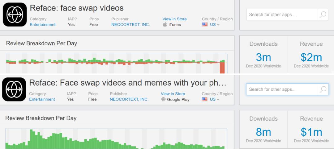五个月的时间过去了,与很多产品的路径相反,REFACE 不仅没有在榜单上“周游”(详见《出海图片 App 跟风打入美国免费总榜一周游,带给我们的 3 点启示》),相反,在下载量和收入上还依然保持着很高的水平。Sensor Tower 的数据显示,2020 年 12 月 REFACE iOS+Android 端的收入在 300 万美元左右,下载量达到 1100 万。