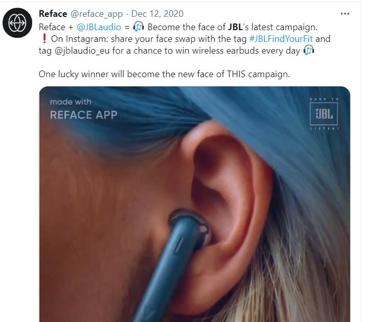 去年 12 月 12 日,REFACE 官方的 Twitter 账号上发推宣布了一项与耳机品牌 JBL 的合作,用户在 Instagram 上 JBL 的标签下发布自己换脸的视频,即有机会赢得 JBL 的无线耳机。