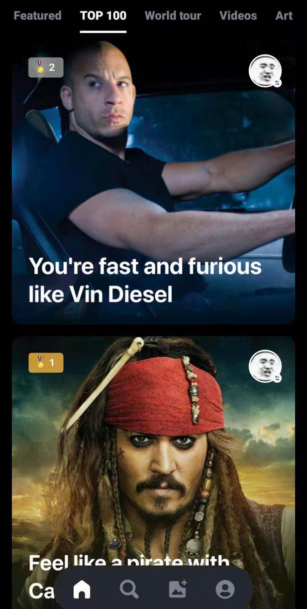 目前在 REFACE 上有两个类似于热搜的功能,一个是此前就有的“精选”功能,用来反映当日最热的换脸人物。此外 REFACE 还独立出来了一个 Top100 的标签,在这个标签下是 2020 年最热门的前 100 个换脸人物,在这个榜单中,热度 Top3 的人物是加勒比海盗、范迪塞尔和钢铁侠。只不过这份热搜榜单的顺序居然是倒着的,排名第一的加勒比海盗要拖到最底下才能看到。