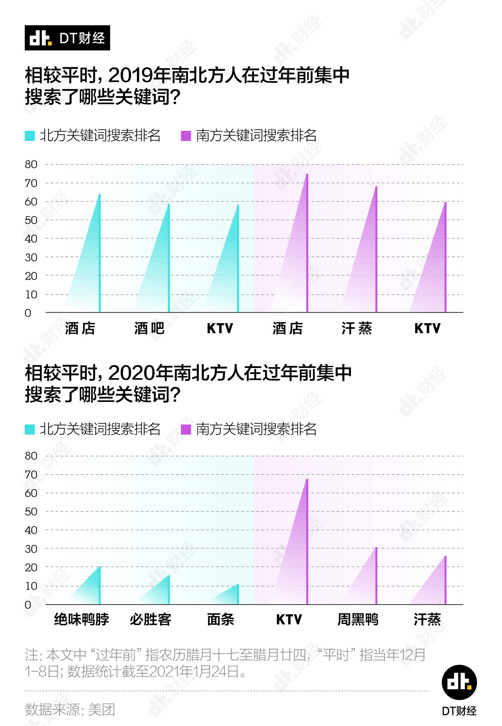 到了2020年过年前,南北方人对食物的搜索开始取代酒店、酒吧等部分关键词。北方人搜索的关键词中,排名上升最快的三项全是食物;南方人仍然将唱K和汗蒸视作春节前的功课之一,但榜单上也出现了周黑鸭——这与北方的绝味鸭脖形成了掎角之势。