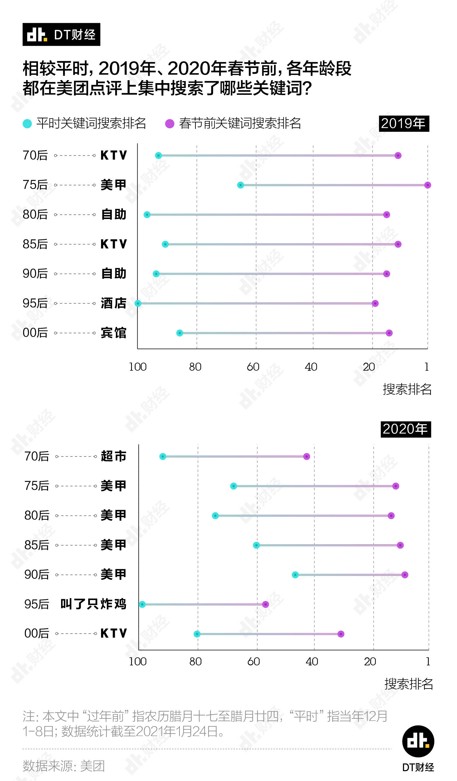 相比00后,春节对于70后和85后的中年人来说,明显是一次难得的压力释放期,唱K就是其中值得一提的放松方式。比如2019年春节前,70后的KTV搜索量相较平时大涨43.3%,KTV的搜索排名直接从平时的第93位蹿升到第11位。