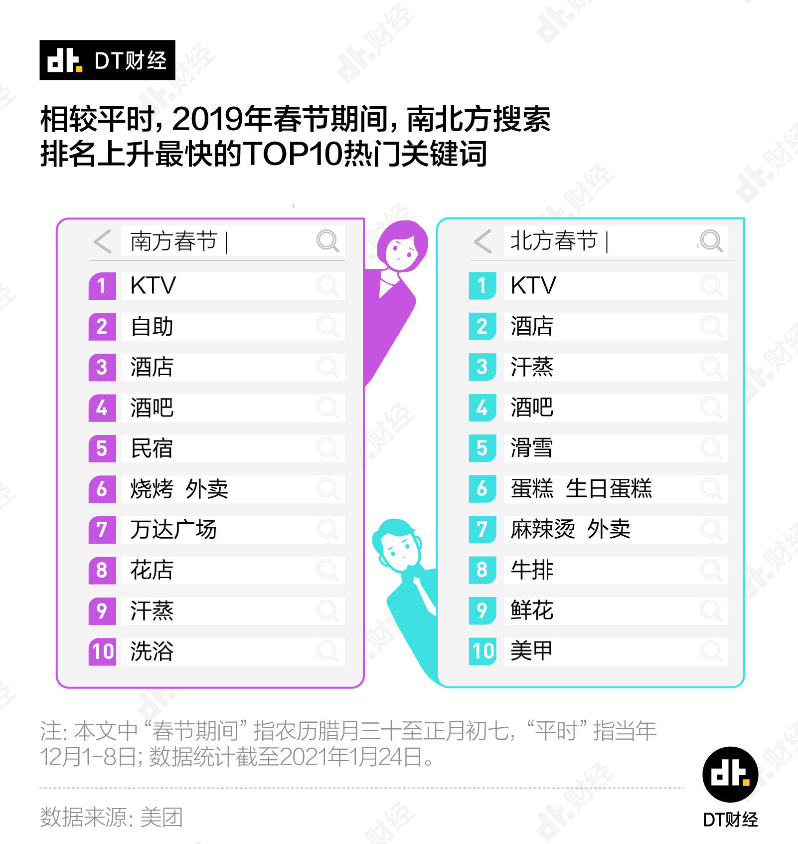 2019年春节期间,北方人在美团上搜索的TOP10活动,除了KTV等传统项目之外,还有滑雪、鲜花等关键词。当北方人在各种天然雪场挑战中高级滑道时,南方人还在为几颗雪籽沾沾自喜地发朋友圈。