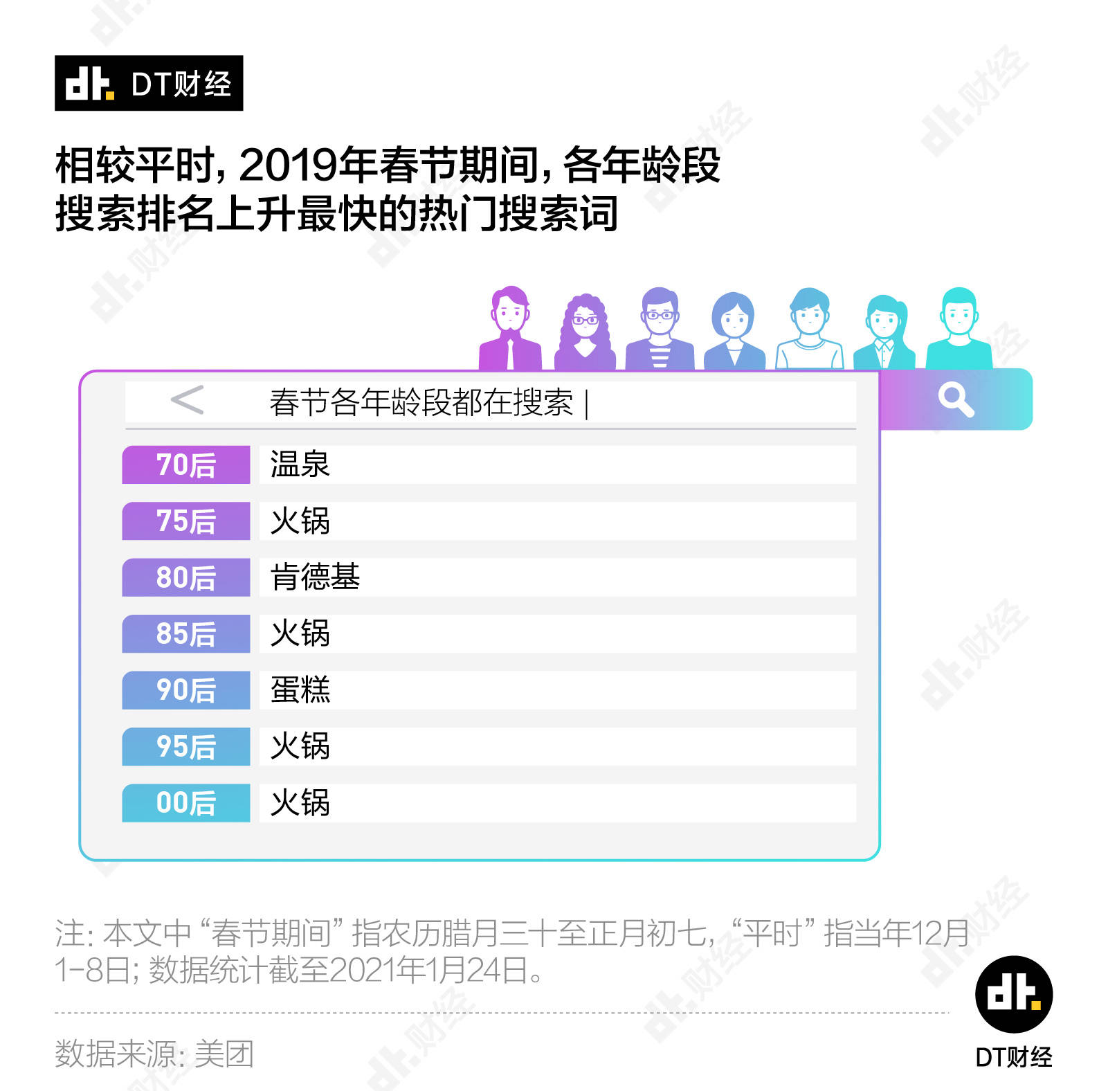 当75后、85后、95后和00后扎堆吃火锅时,70后一头潜进了温泉里。2019年春节期间的70后有多喜欢温泉呢?当时他们搜索“温泉”的量较平时上涨了443.6%,泡汤成了70后心中最有意义的春节仪式感。