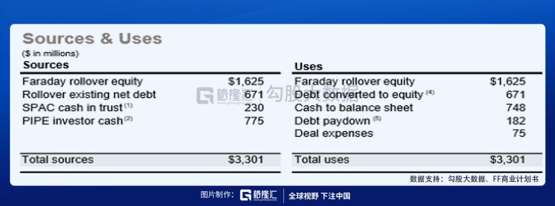 官方给出法拉第未来股权价值为16.25亿美元,现有债务6.71亿美元。而通过本次借壳,SPAC将提供2.3亿美元资金,叠加PIPE募资7.75亿美元,最终合并完成后,FF估值将达到33.7亿美元,同时股本将扩大至3.37亿股,相当于每股发行价10美元。