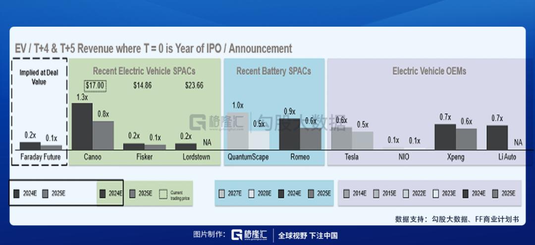 如果乐观一点,蔚来最初上市一直不被看好,但是第一天收盘价后市值已经有一百多亿美元。相比FF的33.7亿美元,也已经是有了三倍之多。FF预计在2022、2024、2025年分别销售2400台、113300台、301800台汽车,从而实现5.04亿美元、105.55亿美元、214.45亿美元。公司2024年、2025年EV/Revenue估值倍数为0.2x、0.1x。横向对比其他近期借壳的电动车企,Canoo的倍数是 1.3x、0.8x,Fisker的倍数是0.2x、0.1x,小鹏的倍数是0.7x、0.6x。即使是时间往前推,对比2014年、2015年特斯拉EV/Revenue估值倍数0.6x、0.5x,FF的估值是在合理范围内的,并没有夸大其词使劲吹捧。
