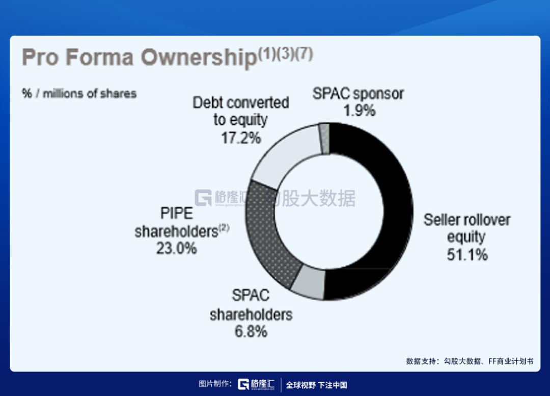 这里介绍一下SPAC的机制,SPAC是区别于传统“IPO上市”和“借壳上市”的第三种上市方式。其创新之处在于,不是买壳上市,而是先行造壳、募集资金,然后再进行并购,最终使并购对象成为上市公司。FF运用SPAC平台借壳上市,PSAC相当于是FF 的子公司,占比8.7%。