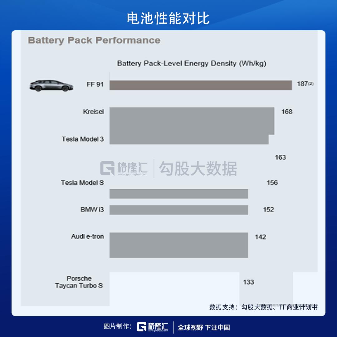 单看电池的话,FF官方介绍中,FF91搭配LGC的21700 NCA电池,NCA电池单体密度能够达到300Kw/kg。由于NCA材料的技术壁垒高,目前产能主要集中在日韩,我国量产较少。FF91自己的电池包含冷却剂的能量密度为173Wh/kg,不含冷却剂的能量密度为187Wh/kg,均高于特斯拉和蔚来。